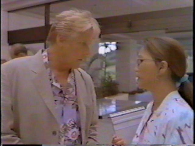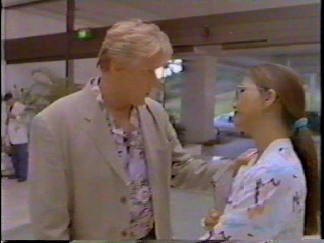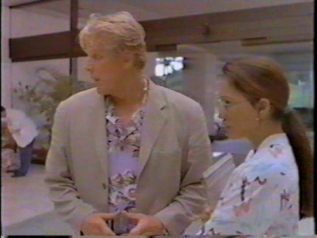 In 1997, Steven J. Cannell of "Rockford Files" fame (and many other TV shows) directed a pilot episode for a new version of Hawaii Five-O. It was never aired, because no one bothered to check that Chin Ho Kelly, one of the characters appearing in the show, had been killed off during Five-O's original run (in fact, in the tenth season finale A Death in the Family, in which Elissa appeared). In the pilot, Governor Dan Williams is shot at the beginning. In the scene below, Elissa plays Gerri, who works at the hospital where Williams has been admitted. She talks to Jimmy Berk (Gary Busey), one of two men selected to run the "new" Five-O. The screen shots were taken from a VHS tape and the quality is not that great.