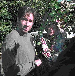 The latest twister is a public-relations spin job yesterday that spun out of control. A week in the birdcage and Duchovny's diss would have been forgotten. But no, the X-Files star took part in a hokey damage- control stunt yesterday orchestrated by Tourism Vancouver. The event was planned for a U.S. TV audience to repair the damage done to the city's reputation after the actor made several classless comments about Vancouver's weather last week on Late Night With Conan O'Brien and the Late Show with David Letterman. Decked out as the "Rainforest Princess" in a twigs-and-leaves outfit, retired BCTV weatherman Norm Grohmann presented Duchovny with a Vancouver Survival Kit. The stunt was initially engineered for the exclusive enjoyment of Entertainment Tonight, a U.S. celebrity gossip show, but other media caught wind of the goofy gag going on off the set at the Travelodge Motel in North Vancouver. After shooting a scene involving driving a car back and forth and hollering "Scully! Scully!" at a locked motel door, Duchovny strolled over to an adjacent parking lot to play "good sport" with Tourism Vancouver, ET and BCTV, which had worked out a coverage deal with The X-Files. The Province and some other media were forcibly barred from the $7,000 gimmick, the brainchild of Tourism Vancouver's p.r. firm, Verus. Duchovny, appearing awkward at times when questioned by Grohmann doing his talking-twig routine, was a good sport, accepting his survival kit and cracking wise about loving the rain. "I've had a wonderful time in Vancouver over the last four years. I love this city. I don't know what's going on," said Duchovny as the cackling Rainforest Princess danced around him. "I'll stay here as long as you keep this man away from me. "You know what a great city you have," Duchovny added. "You don't need me to tell you one way or another." His handlers were less accommodating when the exclusive fluff fest threatened to turn into a media free-for-all. "No, no," said Tracy Elofson, an executive assistant to X-Files producer Chris Carter, to a crew member trying to grant a Province reporter access. "Get him out." The stunt was over in minutes and Duchovny was whisked away in a GMC Suburban, still wearing his FBI gun, facial bruises and flesh wound to the upper chest. When asked why The Province was barred, Elofson said: "I've gotta make some phone calls, sorry." Tourism Vancouver's Janna Ross talked to The Province and CBC TV after the fact. "It does rain in Vancouver but the big thing is, rain is very romantic," said Ross, deflecting questions about unequal access. "And the more it rains, the more David misses his wife (actress Tea Leoni). "We're just glad he even saw us for 10 seconds." ET freelancer Marian Dodd said "ET has a really wonderful relationship with David Duchovny and The X-Files and we're always interested in anything he's doing." She said Verus pitched the idea directly to ET and she wasn't aware that other media would be attending. Verus spokesman Ian Edwards admitted later: "It's not been one of our better days." WEATHER GEAR The Vancouver Survival Kit presented to X-Files actor David Duchovny: