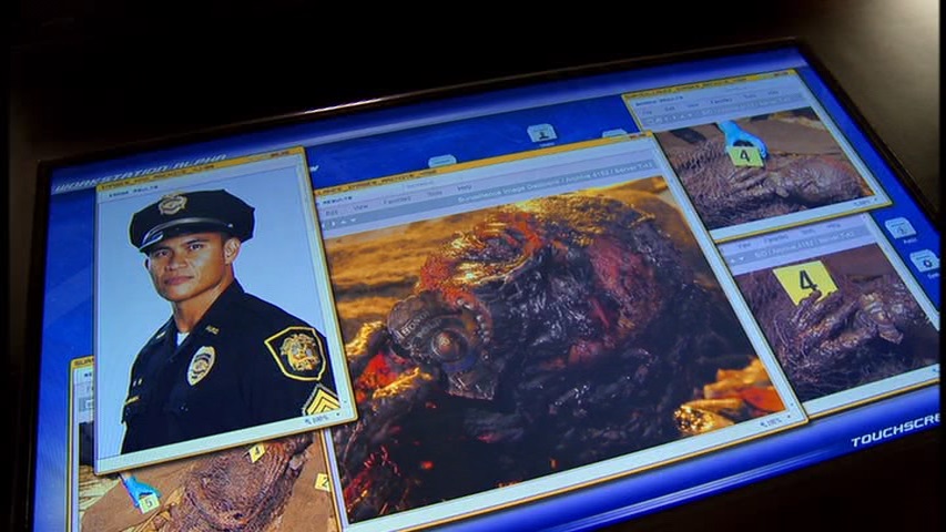 At the forensics lab, Danno's nephew Eric, who now sports a moustache, finds videos of the tourists' murders on Hein's cel phone and also audio from what sounds like another murder. In a far-fetched manner, a house near Ewa Beach is tracked down where there is one more dead tourist couple. And another body is found by Grover at Kamekona's in Grover's own SUV, a guy named David Larsen, which leads to yet another house in Manoa with eight bodies in the basement. The Governor is really pissed now, especially since the press is all over the most recent developments, and she is even talking about putting the islands on quarantine, which seems very extreme. While getting berated by her, McGarrett makes even less eye contact with the governor than before.