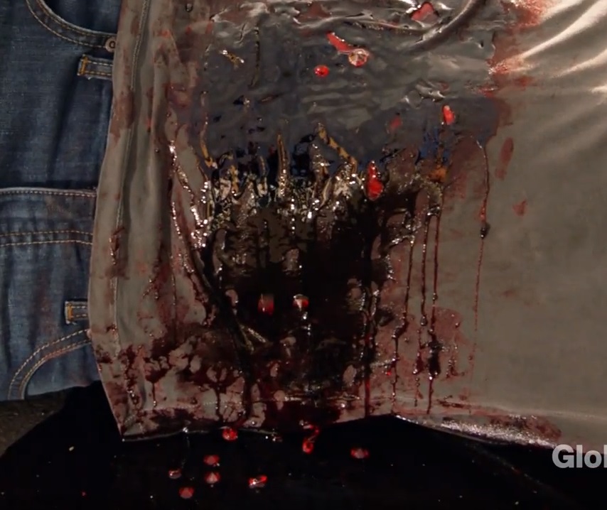 - After he shoots Viktor as he tries to escape from his gang's hideout, McGarrett asks if the red color of his wound is "the color of the booths." Danno replies, "Nah, that's 'Blood'."