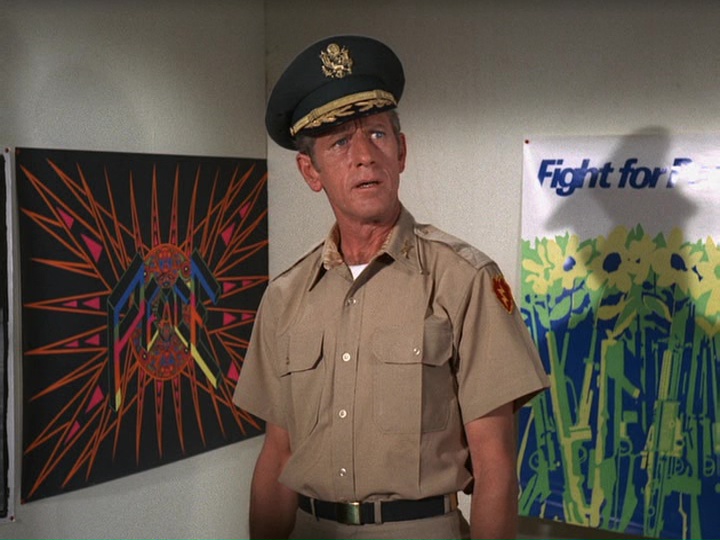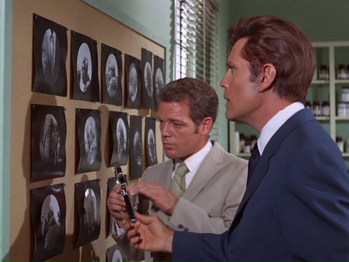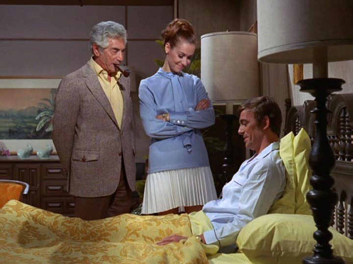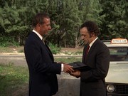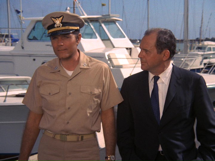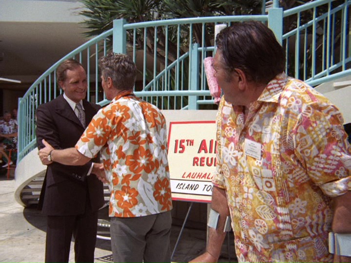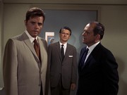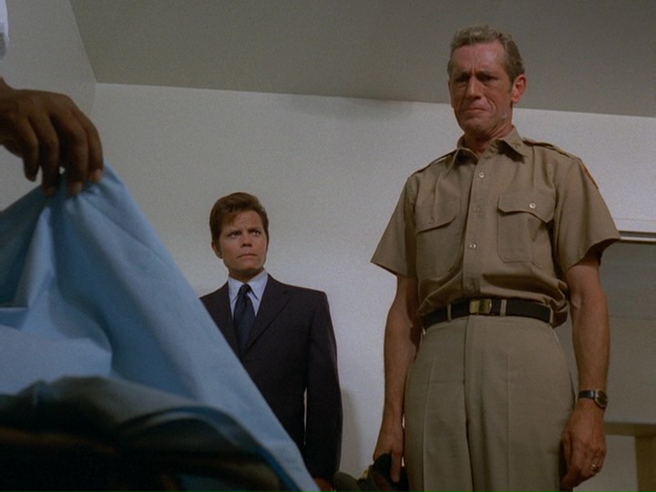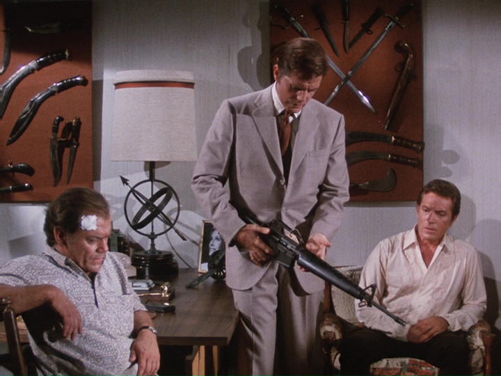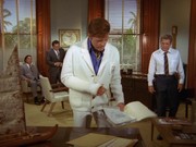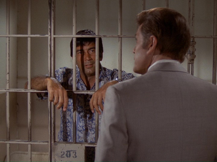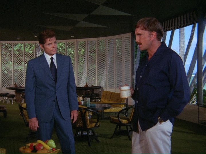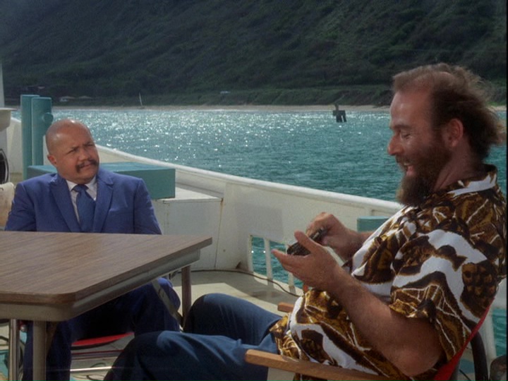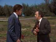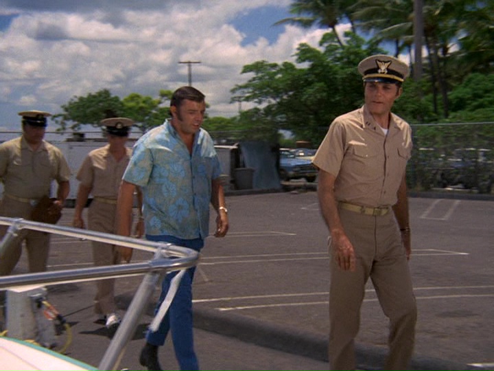 McGarrett is very annoyed in this show. When he shows up at a crime scene where an "intelligence" agent has been shot, he is stonewalled by a security guard. McGarrett knows where to find the man in charge, Sam Kavanaugh (Gerald S. O'Loughlin, who was seen in season one's "The Box" and "Six Kilos"). McGarrett tells him,"Since you're still a little new out here, Mr. Kavanaugh, maybe nobody has told you ... [t]hat not even United States intelligence can cover up a shoot-out and tell me it's none of my business."