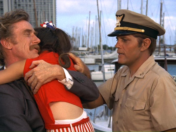 With the 5 p.m. deadline well passed (probably several minutes more) and no consideration for whether Forbes' daughter is going to be killed immediately, McGarrett and Danno, who were only seconds before flying over the yacht, as well as Kono, all appear on a Coast Guard patrol boat beside it, dressed in well-fitting Coast Guard uniforms, as if there was some floating Coast Guard haberdashery nearby, pretending to be "examining vessels to determine compliance with federal boating laws." Lucky for them, the kid is still alive, and Chung hides with her on the yacht, which is quickly uncovered, and Chung is taken out of action. Ellen is rescued and reunited with her father.