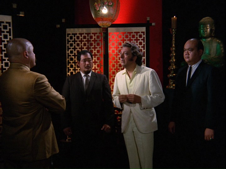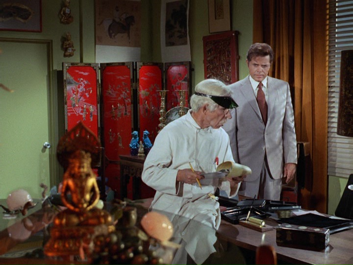 This, of course, is true. On a yacht, Wo is holed up with Chung as well as Oren (the Elvis Presley-imitator-like Nick Nickolas, who was seen at the beginning of the show tipping off Wo that Shepard had left Honolulu Airport by helicopter). We get a brief glimpse of Wo's "human side" when he reminisces about an incident which presumably happened during the Chinese Revolution. He plays chess with the doctor's daughter, saying "I knew a little girl once," and nearly lapses into sentimentality when he describes how this little girl was killed. He goes on, "So few women play chess ... they seem to have no grasp for it." He says, almost with some bitterness, "I don't always enjoy [winning]."