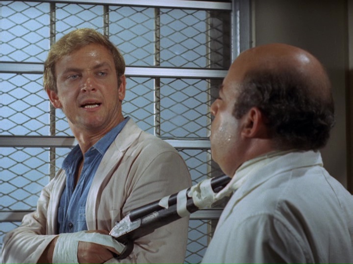 Olena finally takes Marty out, but the timer on the dynamite is still ticking. Through the door, Danno takes nail-biting instructions from the HPD bomb expert Mossman (Doug Mossman). (Danno will later show expertise as someone dealing with bombs in S05E12, "The Clock Struck Twelve.") Though the time frame for the detonator to go off seems to have been exceeded, Danno manages to take care of things using a knife which he just happens to have on him and some wire from the telephone which Marty tore out of the wall, though further details like how the grenade and dynamite on the door are dealt with are not shown.