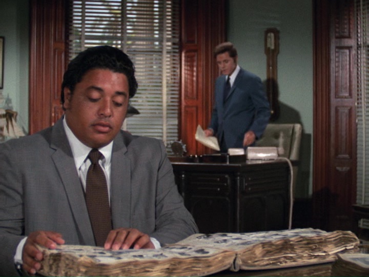 Lon has gone to the Five-O office to see McGarrett. After McGarrett tells him "Your son's life might be in danger," and a great deal of hesitation, Lon shows McGarrett the handkerchief. Interestingly, the embroidery of E.W., which was originally in a script type, is now in a large, sans-serif font. McGarrett immediately contacts Kono and tells him to head to the Phillips' apartment.