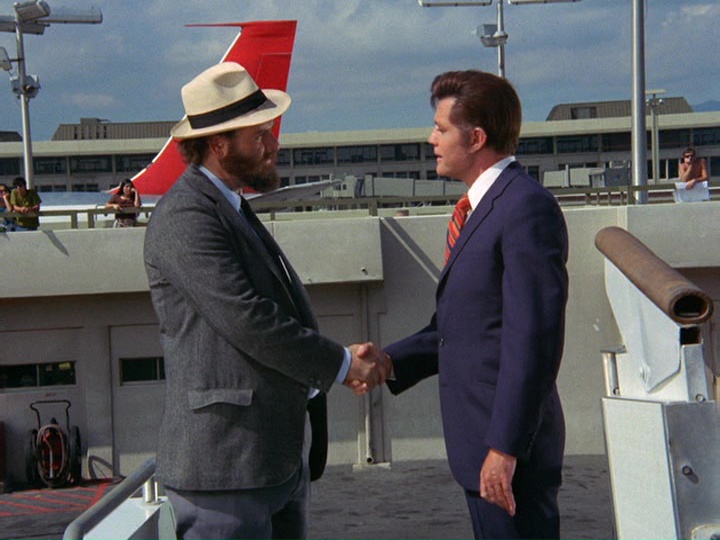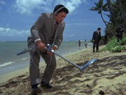 Kavanaugh checks with Jonathan Kaye in Washington, who orders the operation on Shepard to proceed. McGarrett reconstructs what happened when Shepard arrived by helicopter, that he "panicked" when he saw someone who he recognized as a Red Agent who had betrayed him. (This is the usual McGarrett brainstorm, trying to deal with this rationally is difficult.) When McGarrett suggests this is Ralston (Norman Dupont), one of the men on Kavanaugh's team who was "working both sides of the street," Kavanaugh tells him, "You've really gone into orbit, haven't you, McGarrett?"