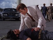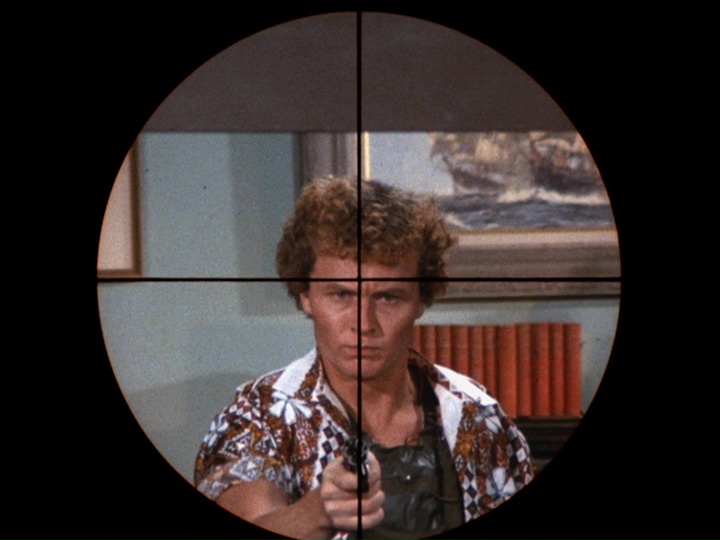 This episode would have been a lot better if it weren't for one huge goof. The brother of Thad Vaughn, who Danno accidentally killed in S01E05, "....And They Painted Daisies On His Coffin," takes people hostage in the Five-O offices, demanding that Danno show up so he can avenge Thad's death. But in this show, Thad's name has been changed to Joey Collins, and his brother, the hostage taker, is Marty Collins (played by Mark Jenkins)!