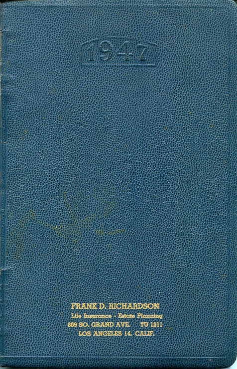 I used to keep diaries for several years of my early life. One of them, containing the material below, had been missing for quite a while, but I finally located it. This is a daily journal, the date on the front cover is 1947. It was from the company of Frank D. Richardson, Life Insurance -- Estate Planning, 609 So. Grand Ave., TU 1211 (?), Los Angeles 14, Calif. I have no idea where this book came from; the days are out of sync with the actual dates in 1956. In the 1950s I had relatives in the Los Angeles area, but I think we visited them in 1958, not 1956. There are entries only on some pages.February 2-25, 1956