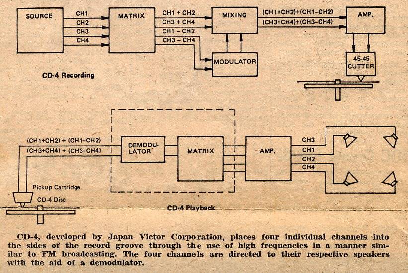 Another advantage for SQ is that since it reduces all the information to two channels, it can be broadcast over existing FM stations, then decoded by the listener to produce four channels. H2>CD-4 System