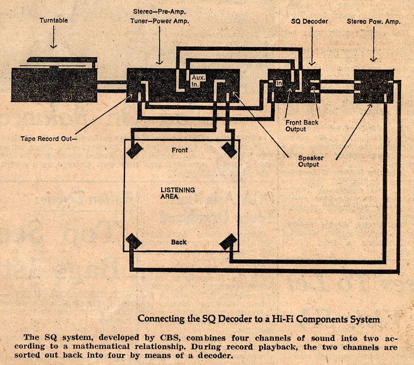 Sonically speaking, the discrete system had the advantage. Discrete tapes of SQ recordings, which could be made into CD-4 discs, when played in comparison with the SQ records, showed much clearer definition not only in sound but in placement of instruments. (Incidentally, Walter Carlos, the man behind the Moog-synthesized Switched-On Bach, last year wrote a letter to Billboard magazine, which claims that the CBS SQ record of this work was "a pale mirror of the quadrasonic master. Worse, the musical balances are irrevocably bastardized so that, at many times, solo lines are obliterated by accompaniment.")